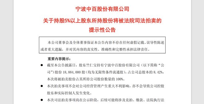 9月23日,宁波中百发布公告称,公司于2024年12月25日收到山东省青岛市中级人民法院(以下简称“青岛中院”)作出的《执行裁定书》,青岛中院将拍卖公司股东竺仁宝持有的公司股份1888.4万股无限售流通股股票。截至公告披露日,竺仁宝持有公司1888.4万股无限售流通股,上述股份目前处于司法冻结状态,占其所持公司股份的100%,占公司总股本的8.42%。
