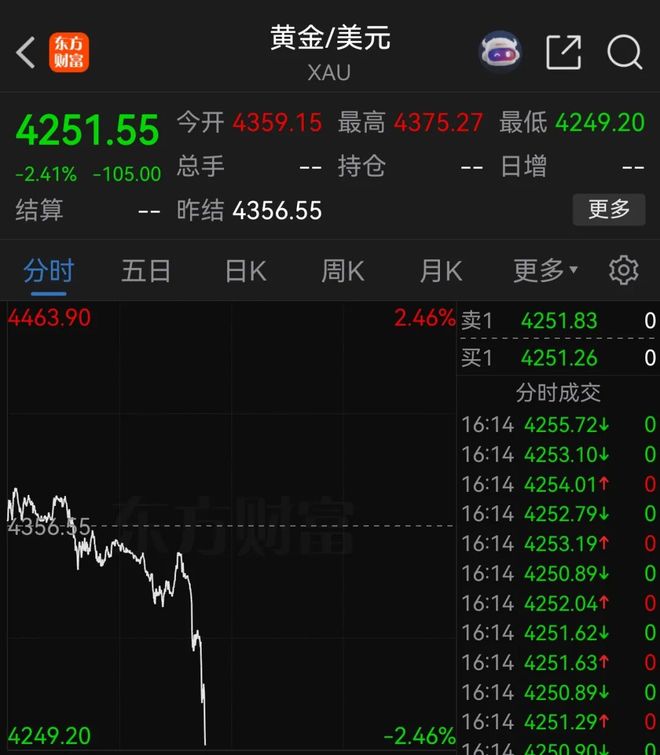 现货黄金跌超2%,报4251.55美元/盎司。
