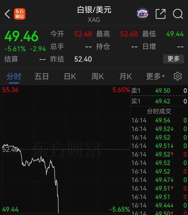 据财联社,截至发稿,现货白银跌超5%,报49.46美元/盎司。此前,现货白银于10月17日创下54.49美元/盎司的历史最高价。