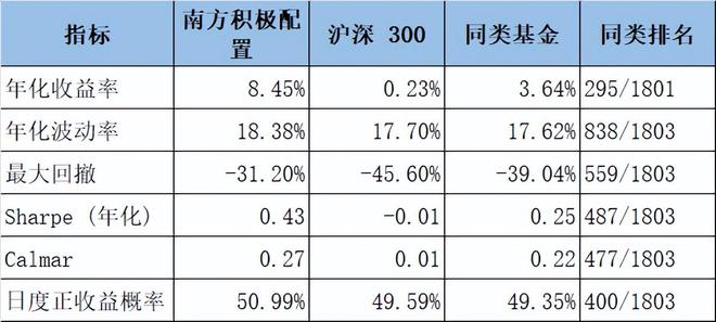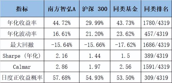 从风险收益比角度,南方智弘混合(A:020645)的Sharpe和Calmar等指标同样显著优于沪深300指数和多数偏股混合型基金。