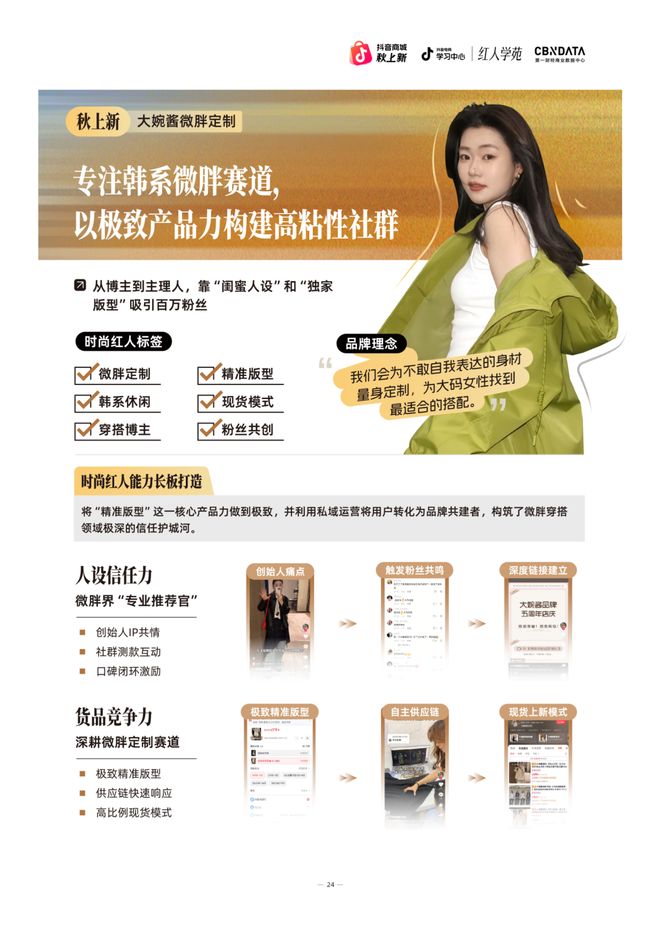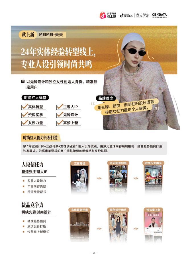 在抖音电商生态中,“时尚红人”的价值定位也日益清晰:不止于带货,更是引领潮流的“时尚发源地”;不止于销售商品,更是演绎穿搭的“风格主理人”;其最终的商业跃迁,是在生意增长之上,沉淀让用户信任的“人格化品牌”。