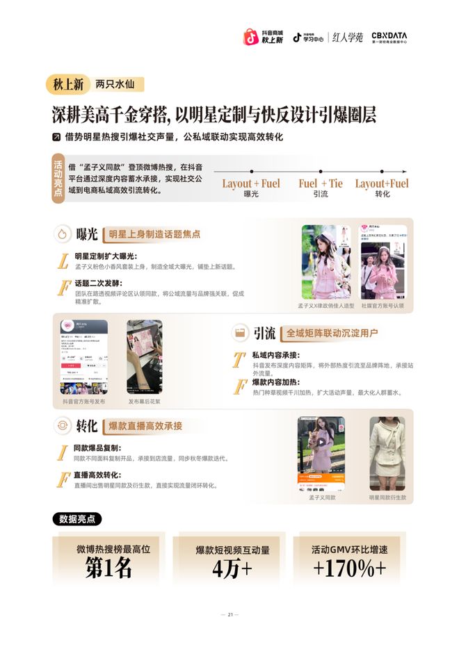 本次抖音商城「秋上新」活动中,两只水仙通过为明星孟子义定制造型,登上微博热搜第一,巧妙地将公域流量引导至品牌阵地。时尚红人采用数据监测与爆款二次开发机制,迅速将明星同款热度转化为可销售的现货。在转化环节同步上线多款衍生设计,有效满足不同消费者的需求。最终实现单条视频超4万的高互动量,印证了其“造风”模式的市场可行性,也创造了新的业绩高峰。