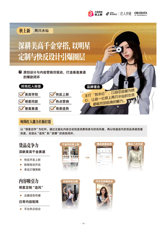 在货品端,时尚红人通过快速反应供应链与数据驱动的产品开发机制,确保能够迅速将流行元素转化为具体商品,以此快速响应热点趋势,持续完善货品迭代。在内容层面,通过精心策划的明星合作制造话题焦点,将明星同款转化为社交货币,再结合平台热点与日常内容输出,拉高时尚内容在大众公域里的传播热度,为品牌高效承接并转化公域流量。