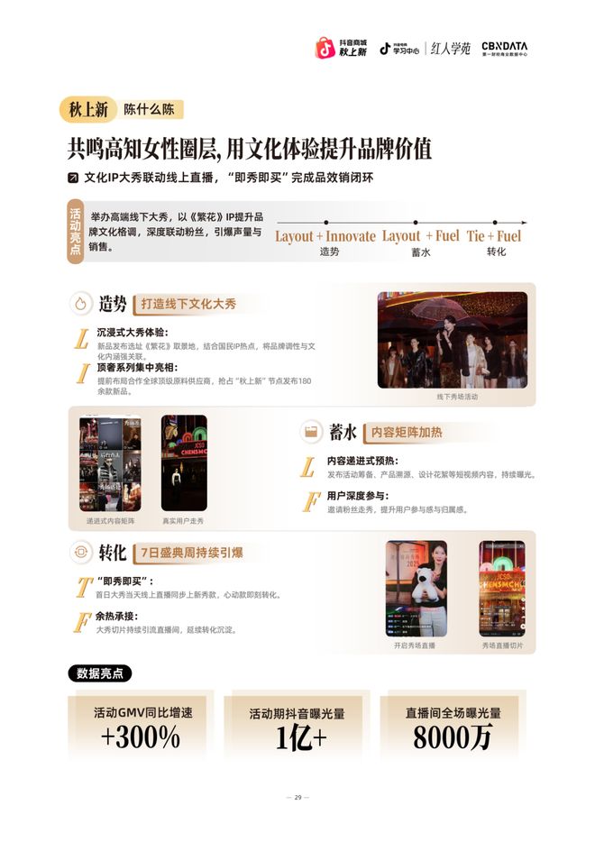 在秋上新活动中,陈什么陈在热门影视剧取景地举办沉浸式大秀,通过国民IP热点提升品牌文化调性。活动特别邀请粉丝参与走秀环节,增强了用户的参与感与归属感。采用“即秀即买”模式,线上直播间同步上新秀场同款,实现从文化体验到消费转化的无缝衔接。这场活动最终创造超高业绩,抖音平台曝光量超1亿次。