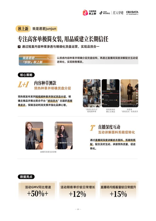 在「秋上新」活动中,君君通过系列短视频进行内容种草,明确分层货盘角色,精准测试市场反应。直播间内,通过深度讲解皮衣面料、剪裁工艺等专业内容,配合即时互动,有效提升转化效率。这场活动最终实现直播间观看量较日常提升15%,印证了其“内容种草测款+直播深度互动”模式在高客单市场的可行性。