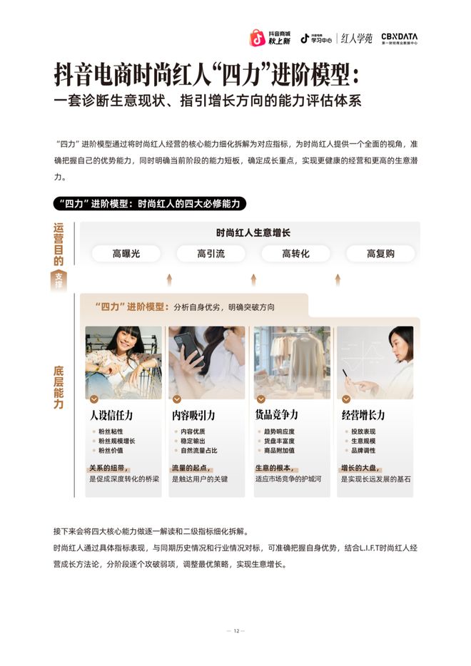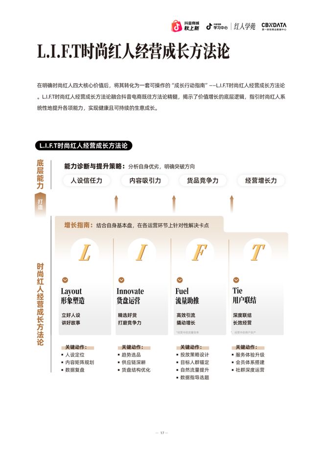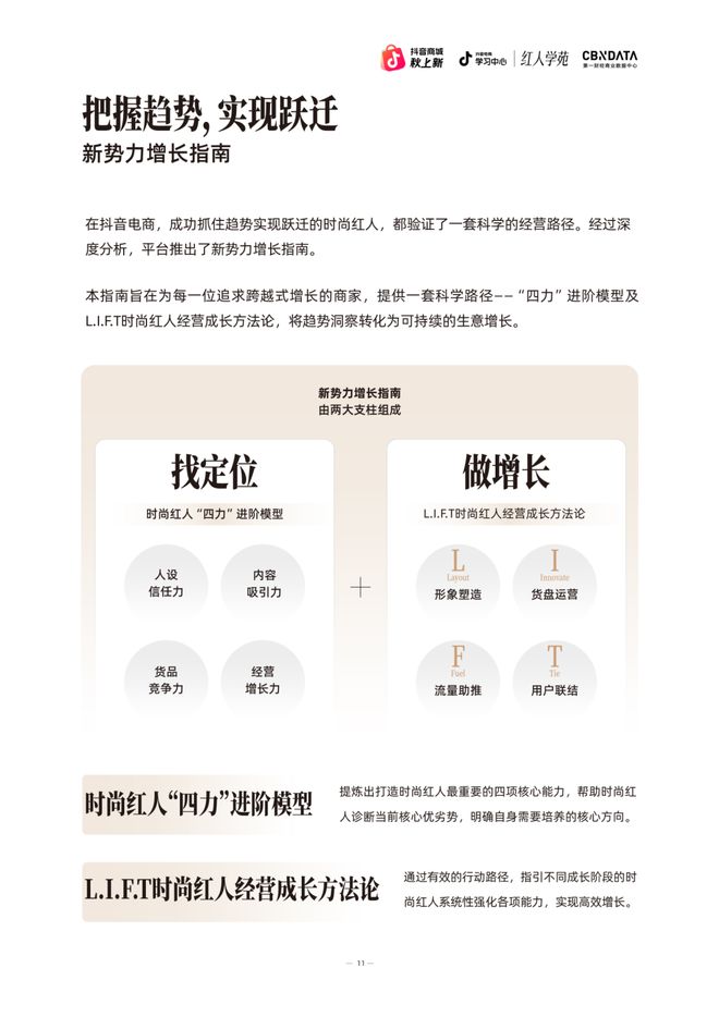 通过“四力模型”的能力建设和L.I.F.T时尚红人经营成长方法论的落地执行,时尚红人可以在抖音电商生态中实现可持续的商业增长,完成从内容创作者到时尚红人商家的本质蜕变。