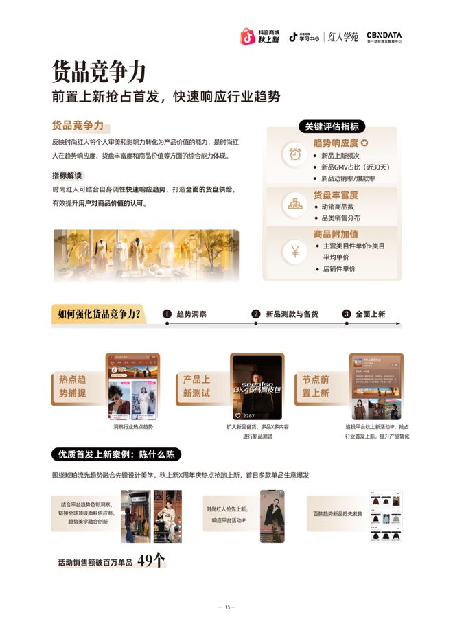 围绕抖音商城「秋上新」“琥珀流光”趋势,时尚红人商家@陈什么陈 快速响应,将全球顶级面料与先锋设计相结合,抢跑市场。其强大的货品竞争力得到充分验证,活动期间销售额破百万的单品达49个。