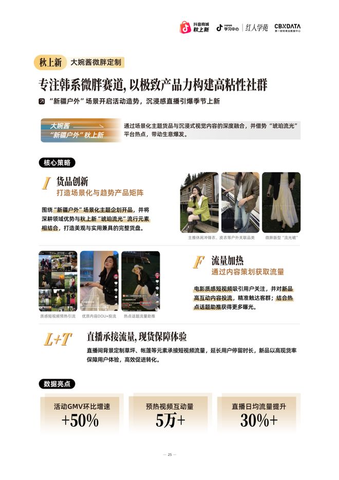 专注韩系微胖垂类赛道五年的@大婉酱,成功开辟出女装红海中的蓝海市场。其核心在于将特定人群的穿搭痛点转化为产品解决方案,展现出人设信任力与经营增长力的有机结合。