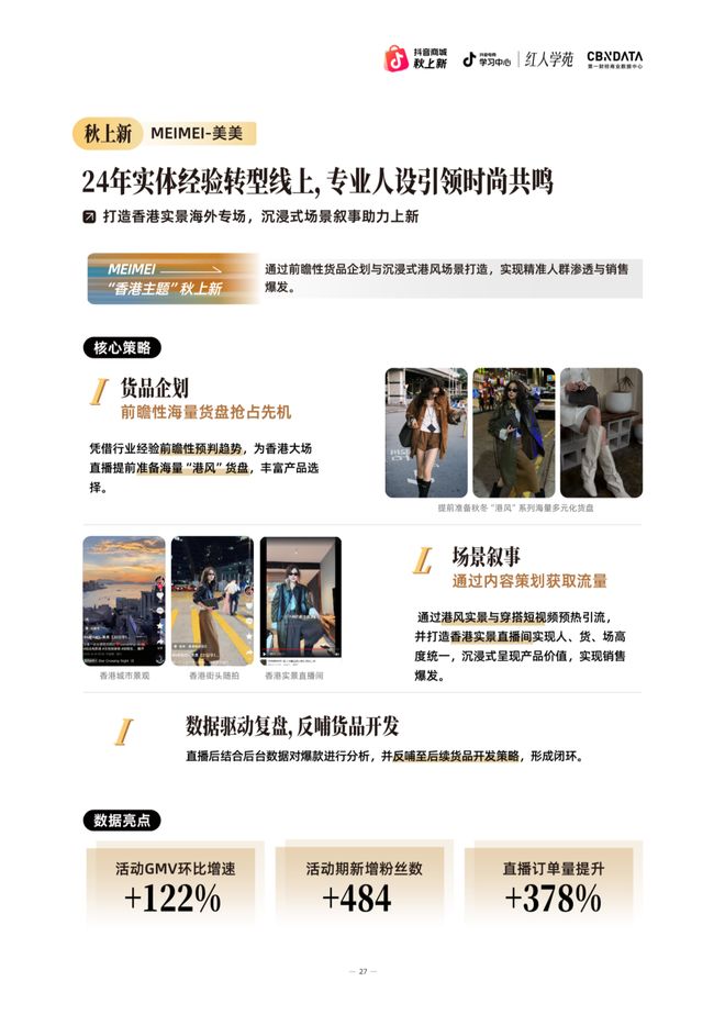 在香港户外直播中,美美凭借对时尚趋势的前瞻性预判,提前布局了海量“港风”主题货盘;并通过港风实景短视频预热引流,打造香港实景直播间,实现了人、货、场的高度统一。沉浸式场景叙事不仅强化了品牌调性,直播后更结合数据复盘反哺至后续货品开发,形成运营闭环,成功将独特的审美体系转化为深刻的品牌印记,实现了品牌势能与用户心智的双重提升。