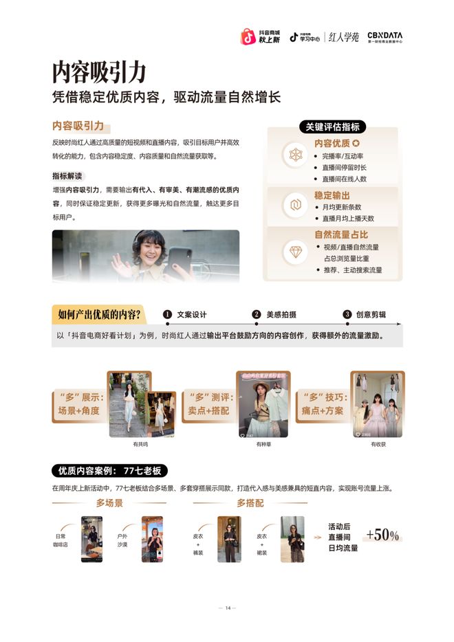 内容吸引力是流量的起点,也是触达用户的关键。时尚红人通过高质量内容吸引目标用户,找到有代入感、有审美、有潮流感的创意方向,并稳定更新和输出,以获得自然流量。而优质内容的持续产出,离不开多元化的文案设计、兼具美感的拍摄以及富有创意的剪辑,共同将创意方向转化为可触达用户的实际载体。例如在周年庆上新活动中,时尚红人@77七老板通过多场景、多搭配的内容策略,成功实现了账号流量的显著上涨。