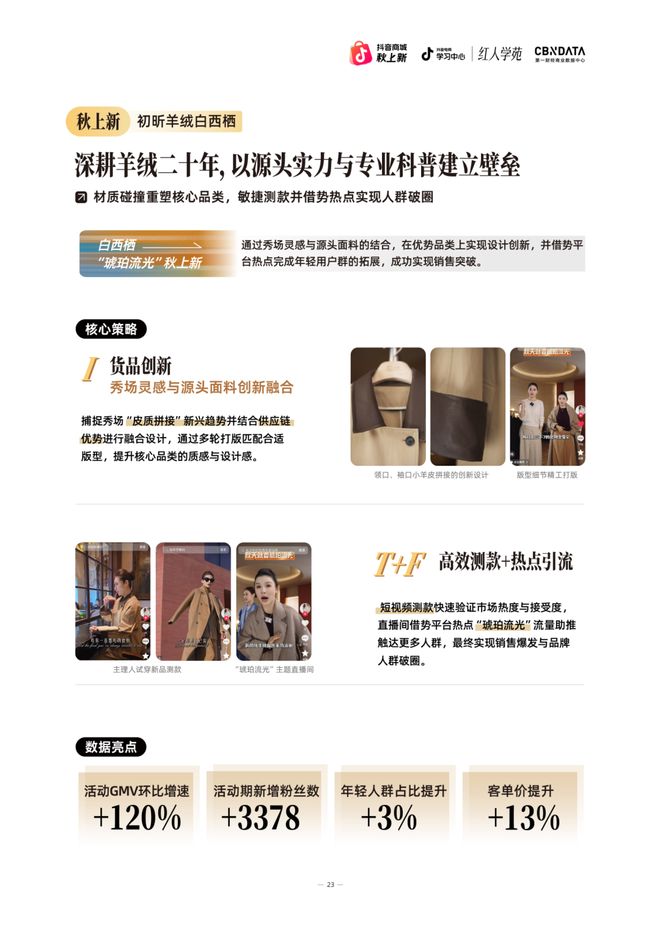 在“琥珀流光”秋上新活动中,品牌展现出对趋势与品质的精准平衡。用货品创新+高效测款+热点引流的核心策略,推动客单价提升13%,GMV实现120%的显著增长,印证了专业信任模式的商业价值,打破优势品类上的设计同质化,并实现了年轻用户群的破圈触达。