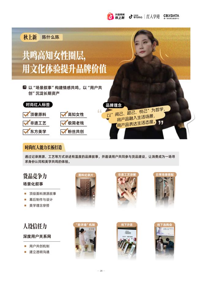 凭借“阅己、越己、悦己”的品牌哲学,陈什么陈侧重于货品竞争力和人设信任力,通过记录顶级面料溯源过程、展示非遗工艺等深度内容建立起文化传播者的专业形象;整合优质供应链资源,将中西美学创新融合,每季新品多达百余个,以扎实的产品力支撑品牌的高端定位,使品牌在竞争中形成了独特的差异化优势。