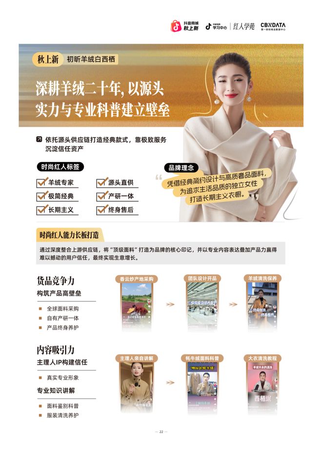 在专业信任构建上,主理人凭借深厚的行业积淀,通过面料溯源、工艺讲解等专业内容持续输出价值,建立起“羊绒专家”的权威形象,塑造独特的内容吸引力。与此同时,品牌依托全球优质原料采购能力与自有产研一体的供应链优势,将顶级原料与匠心工艺深度融合,为自身的货品竞争力提供坚实保障。