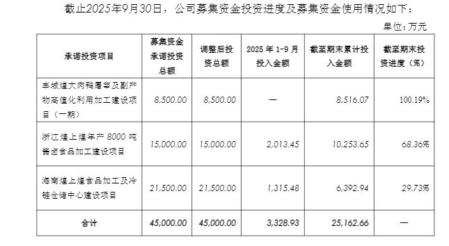 红星资本局注意到,募集资金投资项目情况表显示,浙江煌上煌项目的投资总额为1.5亿元,截至2025年9月30日的投资进度为68.36%;海南煌上煌项目的投资总额为2.15亿元,截至2025年9月30日的投资进度为29.73%。