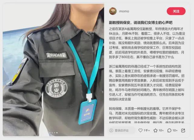 最近,一则小红书帖子近期引发全网热议:一位拥有华五本、QS前50博士学历的浙江某高校副教授,因入职五年后考核未通过,从教学科研岗转岗为校园保安。