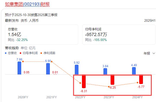 2020年之后,如意集团的财务问题就愈演愈烈。2022年到2025上半年,累计亏损了21亿元。2024年营收才4.49亿,却亏损了5.77亿。今年上半年,实现营业收入1.54亿元,较去年同期的2.28亿元大幅下滑32.25%,归母净利润亏损9572.57万元,与上年同期亏损额扩大105%。