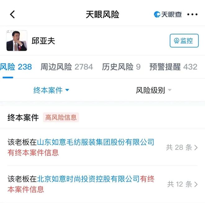 除此之外,天眼查显示,目前邱亚夫名下终本案件(法院判了,却没钱执行的案件)有40起,未履行总余额超过70亿元。邱晨冉名下也有大量“风险事件”,其中自身风险4起,预警提醒的案件更是多达430起,很多是劳动仲裁未履行。