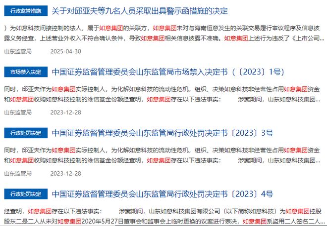 如意集团“这一劫”早有预兆,2023年到2025年,如意集团因为财务造假、关联交易等问题,多次被山东证监会采取责令改正、出具警示函的监管措施。比如,如意集团2022年到2023年年报中对一项长期股权投资减值计提不充分,另外2021年至2022年对相关关联交易也未按照规定履行审议程序和信披义务。