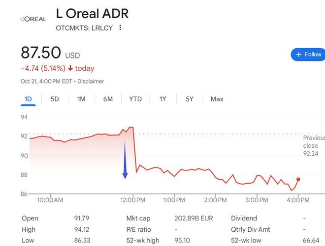 财报公布后,临近美股午盘时曾涨约2%的欧莱雅美股粉单盘中跳水,迅速转跌,短短5分钟左右,盘中跌幅扩大到5%以上,此后进一步下挫,美股尾盘刷新日低至86.33美元时,日内跌6.4%,最终收跌逾5.1%。