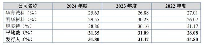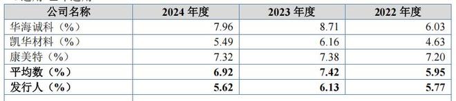 报告期内,创达新材综合毛利率水平和波动趋势与可比公司平均值不存在显著差异。2022年,公司综合毛利率水平低于可比公司;2023年、2024年,公司综合毛利率水平与凯华材料基本相当,高于华海诚科,低于康美特。