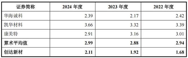 2022年-2024年,创达新材研发费用分别为1,794.92万元、2,113.81万元、2,355.32万元,占营业收入的比例分别为5.77%、6.13%、5.62%,低于可比同行均值5.95%、7.42%和6.92%。