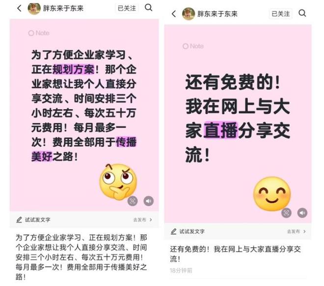 据九派新闻10月21日报道,于东来发文称:“为了方便企业家学习、正在规划方案!哪个企业家想让我个人直接分享交流、时间安排三个小时左右、每次五十万元费用!每月最多一次!费用全部用于传播美好之路!”随后,其还发文称:“还会有免费的,我在网上与大家直播分享交流。”