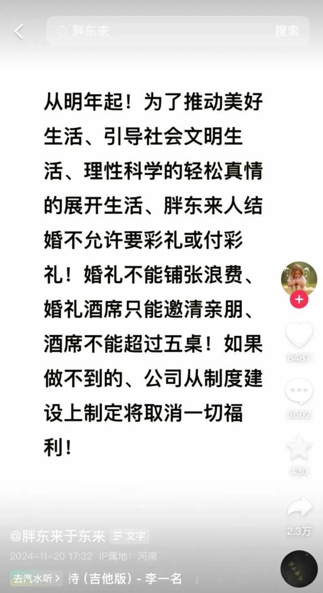 自此于东来频频开始被舆论裹挟。年初胖东来的“员工结婚执行标准”在引发热议的同时也把于东来推向风口浪尖,支持者认为是真正的移风易俗,反对者则认为胖东来干涉员工私生活。