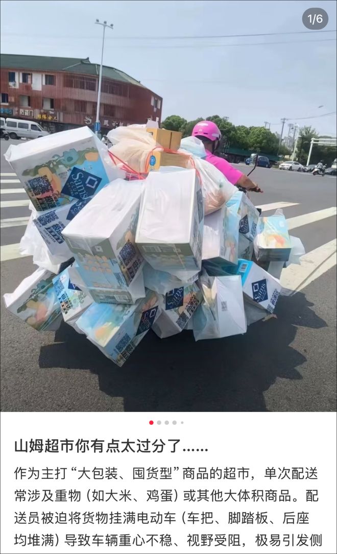 近日,多地网友爆料,山姆会员商店(以下简称“山姆”)配送员驾驶的电动车,粮油货物堆积如山,从车把挂到车尾,行驶中一路摇摇晃晃,看起来随时可能掉落。