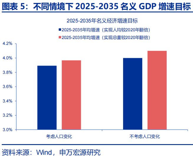 即便“十四五”规划已淡化经济总量目标、重视结构发展,但实现社会主义现代化建设目标,或仍对“十五五”经济增速有一定要求。为了实现2035年社会主义现代化目标,我国经济总量/人均国内生产总值比2020年翻一番,“十五五”和“十六五”阶段,我国或需至少保持年均4.4%左右的经济增长水平。