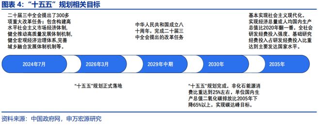 二十届三中全会部署的300多项改革任务要求2029年前完成,未来五年或亦是进一步全面深化改革的关键时期。党的二十届三中全会明确部署了300多项改革任务,同时明确两个重要的时间节点,到2029年完成本决定提出的改革任务,到2035年基本实现社会主义现代化。改革任务涵盖经济体制、科技人才、绿色转型、民生保障等15个关键领域。市场化改革(如全国统一大市场建设、民营经济促进法等)、新质生产力培育(新兴产业、未来产业发展、科研体制破壁等)、绿色低碳转型(非化石能源占比25%、单位GDP碳排降65%以上)及民生制度完善(社保全国统筹、生育支持体系等)或是“十五五”期间改革的重点方向。