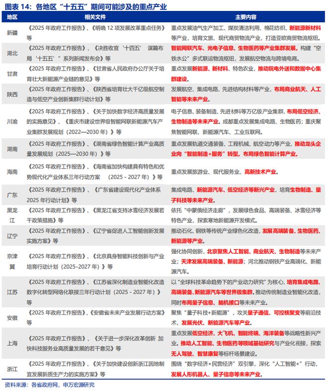 “十五五”产业规划中,“新质生产力”培育或仍是重点。从政策跟踪情况来看,“十五五”规划中的“新兴支柱产业”或将延续“十四五”规划的框架。2025年4月的政治局会议首次提出“打造一批新兴支柱产业”,7月的政治局会议则进一步强调“加快培育具有国际竞争力的新兴支柱产业”。此外,三中全会明确提出要“健全因地制宜发展新质生产力体制机制”“健全促进实体经济和数字经济深度融合制度”。