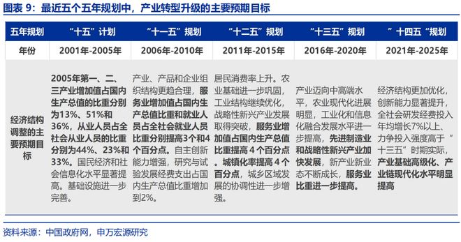 从五年规划的目标设定与实施逻辑来看,产业转型升级不仅是五年规划的重要组成部分,更是实现规划核心目标的“关键手段”。五年规划中,总量目标是核心,而经济结构调整目标则是实现总量目标的路径,即通过发展何种产业来推动经济增长。从“十五”计划到“十三五”规划,三次产业的比例会有预期目标。“十三五”规划起,政策更注重先进制造业发展;“十四五”规划,细化了研发经费投入、创新等目标。