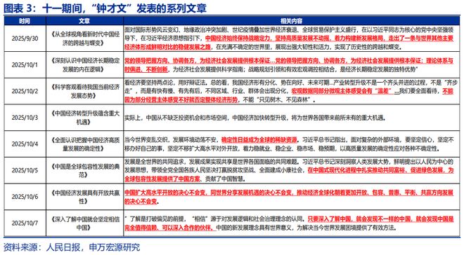 政治局会议后,人民日报连续推出8篇署名“钟才文”的系列文章,亦对新一轮五年规划有所指引。“钟才文”文为中央财经委员会发表重要专论的署名。系列文章发布于四中全会召开前,围绕“经济形势怎么看经济工作怎么干” 从全球视角切入,深入中国经济的内在逻辑,客观分析短期与长期经济发展态势。文章提出的“产业转型升级不是‘齐步走’,宏观数据同部分微观主体感受会有‘温差’,要通过改革与政策给力,着力缩小‘温差’…中国经济加快转型升级,将为世界各国带来前所未有的重大机遇”或意味着新的五年规划中经济产业转型、政策加码、改革支持或是重点。