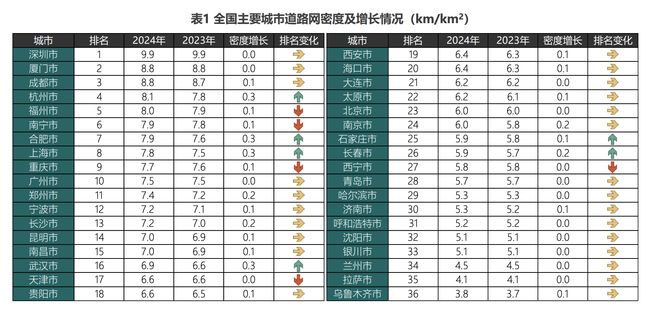 从当前达标情况来看,截至2024年第四季度,我国道路网密度达到8km/km²标准的城市有5个,分别是深圳、厦门、成都、杭州和福州,均地处南方地区。