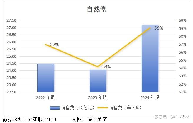 2022年至2024年,自然堂的销售费用分别为24.45亿元、24.06亿元、27.16亿元,占各相应期间总收入的57%、54%、59%;今年上半年,销售费用占总收入的比例依旧高达55%,也就是说,超过一半的收入都用于营销推广了。