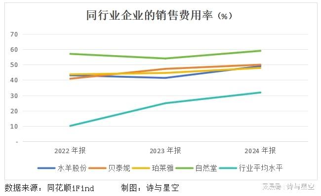 在整个行业来看,近三年自然堂的销售费用率遥遥领先,对比研发投入一降再降,从2022年1.02亿元降至2024年的9120万元,一方面说明公司更依赖营销提升营收而不是通过研发,另一方面也说明营销活动的有效性不佳,一定程度上反而拖累了公司业绩。