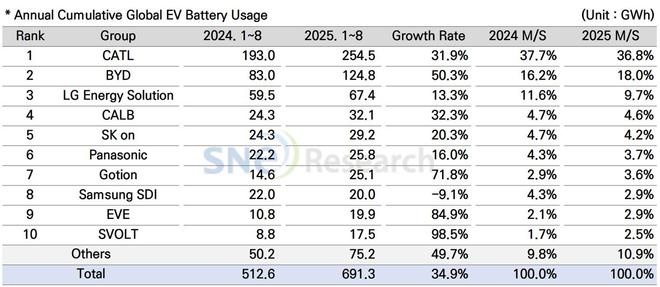 2025年1-8月全球动力电池企业装机量 图片来源:SNE Research