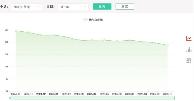 在批发端,猪肉价格也持续下降。据农业农村部“全国农产品批发市场价格信息系统”监测,自进入8月份,猪肉批发均价已连降十周(注:9月26日至10月2日当周没有相关监测数据,未统计在内),10月10日至16日当周,猪肉批发均价为18.43元/公斤,环比降3.1%,同比降26.6%,较7月底当周的20.59元/公斤跌去10.49%。