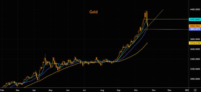 周二,现货黄金价格盘中一度暴跌6.3%,创下逾12年来最大单日跌幅,这一波动被视为“5西格玛”级别的罕见事件。金价一度下探4000美元整数关口,该水平恰好与其21日移动平均线重合。尽管金价随后有所反弹,但仍面临显著压力。从技术层面看,4000美元是黄金当前最重要的支撑。若黄金跌破4000美元,下方支撑或在3800美元。