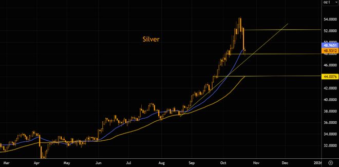 与此同时,白银市场也同步承压。银价正围绕其21日移动平均线波动,并徘徊在48美元这一关键水平附近。分析指出,该点位是白银短期的“成败线”,其有效性将直接影响投资者情绪。若失守48美元,或将下探44美元。