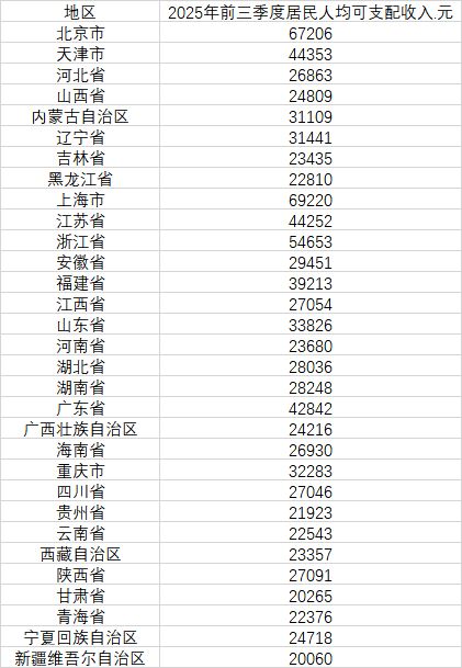 31省份2025年前三季度居民人均可支配收入