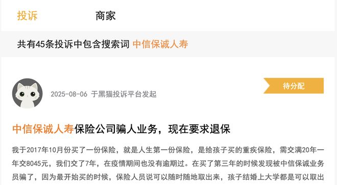 从黑猫投诉平台反馈的信息来看,截至2025年10月22日,45条针对中信保诚人寿的消费投诉中共有33条投诉直接指向虚假宣传,从一个侧面表明销售与服务质量构成了中信保诚人寿综合退保率高的主要因素,折射出的则是公司内部治理的问题。