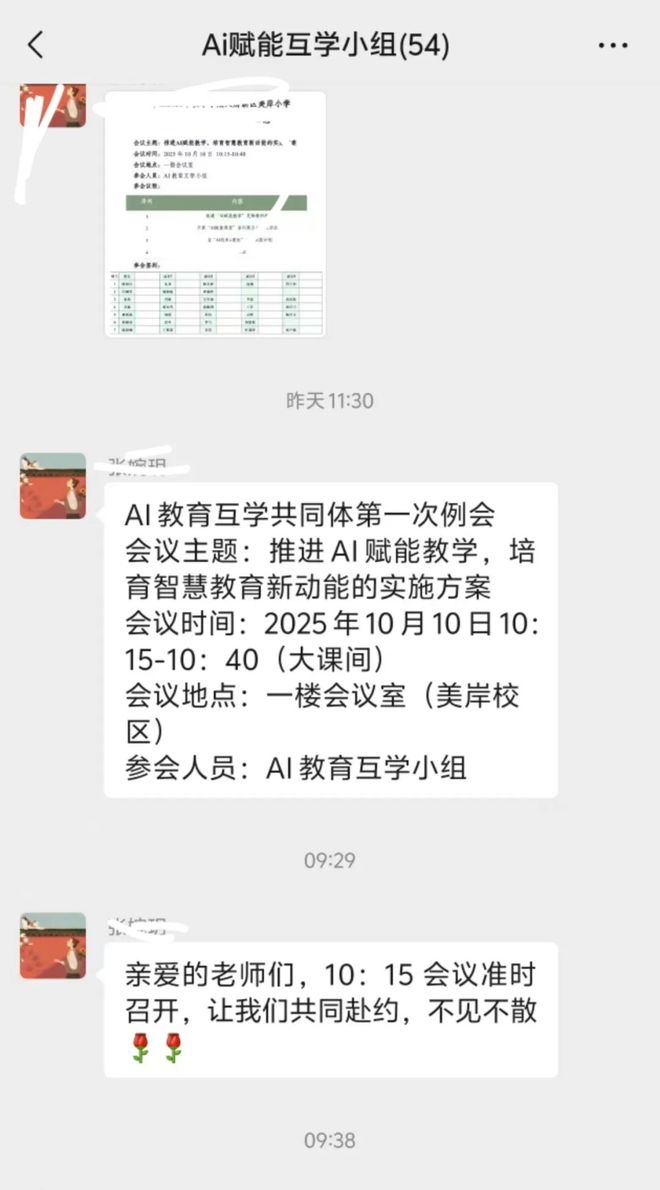 为了让语文老师们更好掌握人工智能技术,有不少地方的学校也是费了尽心思,他们生怕老师们会落后于新技术的潮流,以至于有的还成立了一个“AI赋能互学小组”。