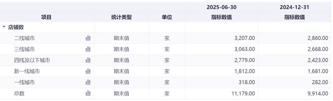 其中,一线城市、新一线城市、二线城市、三线城市、四线及以下城市门店分别为318、1812、3207、3063、2779家,较2024年底净增36、131、347、395、356家。