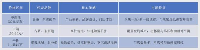 以喜茶、奈雪的茶为代表的高端茶饮品牌聚焦二线以上城市,门店密度低但客单价高;以古茗、茶百道、沪上阿姨为代表的中端茶饮店主打高性价比,通过快速加盟扩张市场;以蜜雪冰城为代表的平价奶茶店则追求极致性价比,主流产品价格在10元以下区间。