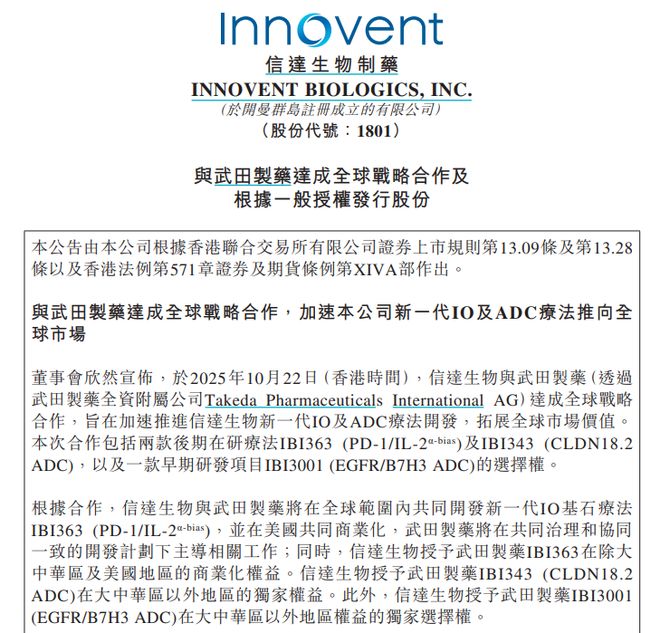 红星资本局10月22日消息,今天上午,信达生物(01801.HK)宣布与武田制药达成全球战略合作,旨在加速推进信达生物新一代IO(肿瘤免疫)与ADC(抗体偶联药物)疗法的全球开发。本次合作包括两款后期在研疗法IBI363(PD-1/IL-2α-bias)及IBI343(CLDN18.2 ADC),以及一款早期研发项目IBI3001(EGFR/B7H3 ADC)的选择权。