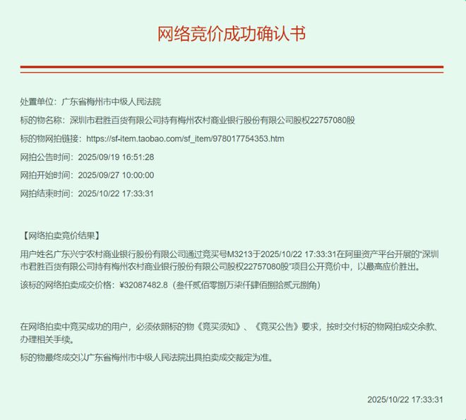 据拍卖平台的公布的竞价结果确认书,兴宁农商银行10月21日通过竞买号M321、B1757、C6595、I2580出价,使变卖进入24小时倒计时,并于10月22日结束变卖,拿下上述3家公司所持梅州农商银行的全部股份,代价合计1.04亿元。