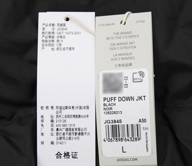 记者在阿迪达斯京东自营旗舰店看到,店内的多款羽绒服吊牌图片显示,产品经销商为阿迪达斯体育(中国)有限公司,制造厂名为江苏雪中飞制衣有限公司。此外,记者还发现,店内一款价格近900元的短款宽松羽绒服填充鸭绒180g,绒子含量为80%,标注的厂商为嘉兴广越服装有限公司。