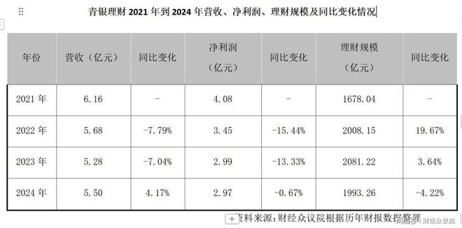 从2022年开始,青银理财遭遇营收、净利润双降,尤其是净利润连降3年。2024年营业收入、净利润分别为5.5亿元、2.97亿元,净利润创成立以来的最低水平,当年理财管理规模回落至2000亿元以下。