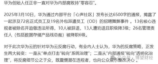 华为创始人任正非对内部腐败一直持“零容忍”态度。据《财联社》等报道,2025年3月10日,华为通过内部平台“心声社区”通报了一起涉及72名正式员工和19名外包员工的招聘舞弊事件。此次对云计算高管的问责,是这一治理逻辑的延续和强化。
